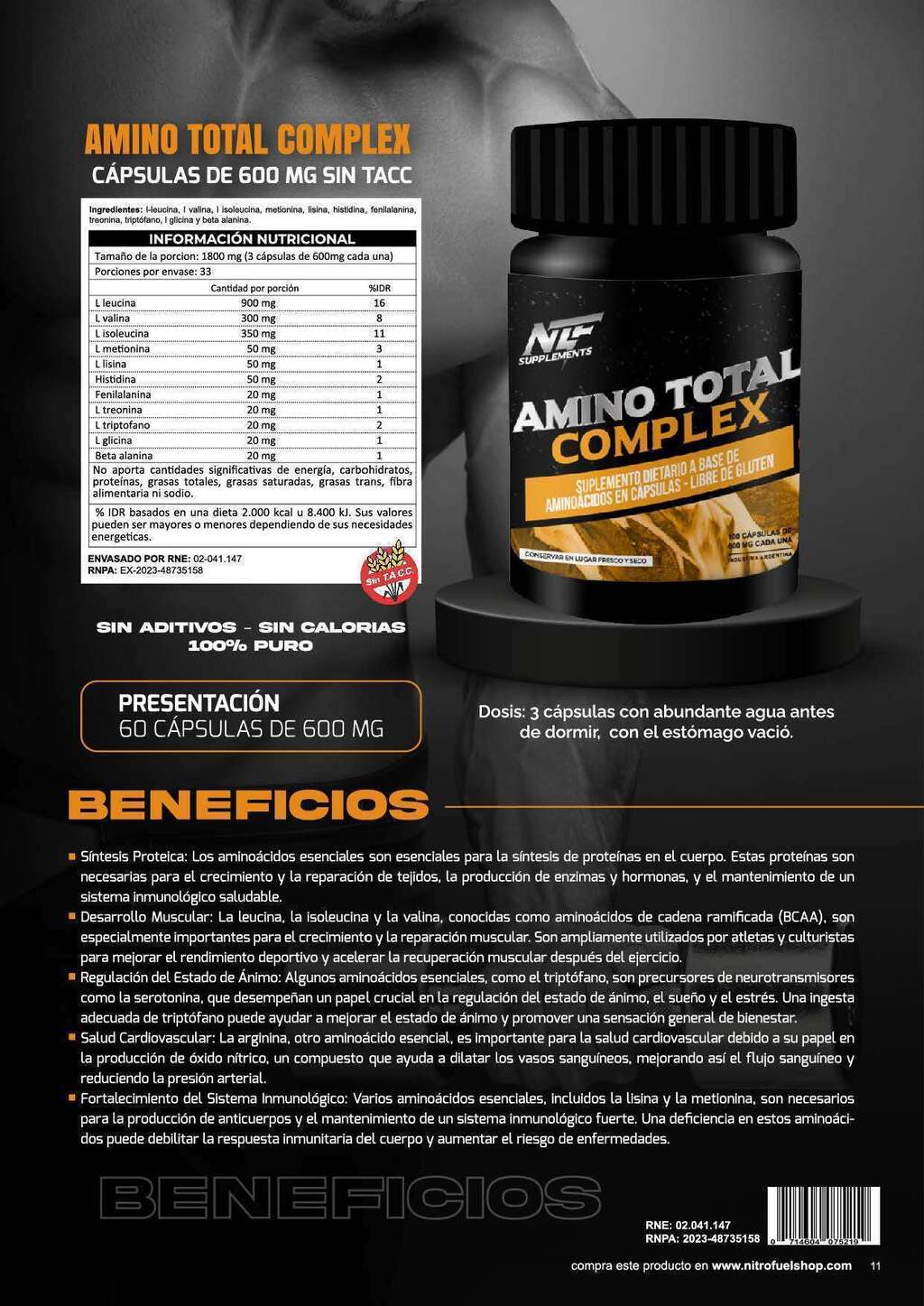 AMINO TOTAL COMPLEX X 60 CAPSULAS DE 600 MG CADA UNA LIBRE DE TACCRNE: 02.041.147RNPA: 2023-48735158DOSIS: 3 CAPSULAS X DIA CON EL DESAYUNO ENVIOS A CAPITAL SOLO POR MOTO NO POR CORREO LA MOTO VA DE 13 A 21 HS COSTO 4500 PESOS SUPLEMENTO PURO SIN ADITIVOSSIN CALORIASSIN MALTODEXTRINACOMPOSICION DE AMINOACIDOS en la segunda imagen BENEFICIOS DEL CONSUMO DE AMINOACIDOS ESENCIALES Beneficios de los Aminoácidos Esenciales para la SaludLos aminoácidos esenciales son los bloques de construcción fundamentales de las proteínas y desempeñan un papel vital en el mantenimiento de la salud y el bienestar del cuerpo humano. Estos compuestos orgánicos son cruciales porque el cuerpo humano no puede producirlos por sí mismo, por lo que deben obtenerse a través de la dieta. En este artículo, exploraremos en profundidad los beneficios que los aminoácidos esenciales ofrecen para la salud y cómo incorporarlos de manera efectiva en nuestra alimentación diaria. ¿Qué son los Aminoácidos Esenciales?Los aminoácidos esenciales son un conjunto de nueve compuestos que el cuerpo humano necesita pero no puede producir de forma endógena. Estos son: histidina, isoleucina, leucina, lisina, metionina, fenilalanina, treonina, triptófano y valina. Cada uno de estos aminoácidos desempeña funciones específicas y vitales en el cuerpo, desde el mantenimiento de tejidos musculares hasta la síntesis de neurotransmisores. Beneficios para la Salud de los Aminoácidos EsencialesSíntesis Proteica: Los aminoácidos esenciales son esenciales para la síntesis de proteínas en el cuerpo. Estas proteínas son necesarias para el crecimiento y la reparación de tejidos, la producción de enzimas y hormonas, y el mantenimiento de un sistema inmunológico saludable. Desarrollo Muscular: La leucina, la isoleucina y la valina, conocidas como aminoácidos de cadena ramificada (BCAA), son especialmente importantes para el crecimiento y la reparación muscular. Son ampliamente utilizados por atletas y culturistas para mejorar el rendimiento deportivo y acelerar la recuperación muscular después del ejercicio. Regulación del Estado de Ánimo: Algunos aminoácidos esenciales, como el triptófano, son precursores de neurotransmisores como la serotonina, que desempeñan un papel crucial en la regulación del estado de ánimo, el sueño y el estrés. Una ingesta adecuada de triptófano puede ayudar a mejorar el estado de ánimo y promover una sensación general de bienestar. Salud Cardiovascular: La arginina, otro aminoácido esencial, es importante para la salud cardiovascular debido a su papel en la producción de óxido nítrico, un compuesto que ayuda a dilatar los vasos sanguíneos, mejorando así el flujo sanguíneo y reduciendo la presión arterial. Fortalecimiento del Sistema Inmunológico: Varios aminoácidos esenciales, incluidos la lisina y la metionina, son necesarios para la producción de anticuerpos y el mantenimiento de un sistema inmunológico fuerte. Una deficiencia en estos aminoácidos puede debilitar la respuesta inmunitaria del cuerpo y aumentar el riesgo de enfermedades. Cómo Incorporar Aminoácidos Esenciales en la Dieta La mejor manera de asegurarse de obtener suficientes aminoácidos esenciales es consumir una dieta equilibrada y variada que incluya fuentes de proteínas completas. Algunas de las mejores fuentes de aminoácidos esenciales incluyen: Carnes magras como pollo, pavo y carne de res.Pescados y mariscos como salmón, atún y camarones.Huevos y productos lácteos como leche, queso y yogur.Fuentes vegetales como tofu, tempeh, quinoa y legumbres.Además de los alimentos enteros, los suplementos de aminoácidos también están disponibles en el mercado y pueden ser útiles para aquellos que tienen dificultades para obtener suficientes aminoácidos a través de la dieta sola. Sin embargo, es importante consultar a un profesional de la salud antes de comenzar a tomar suplementos para determinar la dosis adecuada y evitar posibles efectos secundarios.En resumen, los aminoácidos esenciales son nutrientes fundamentales que desempeñan un papel vital en numerosas funciones corporales y en el mantenimiento de la salud y el bienestar en general. Al asegurarnos de obtener suficientes aminoácidos esenciales a través de una dieta equilibrada y variada, podemos optimizar nuestra salud y promover un funcionamiento óptimo del cuerpo y la mente.