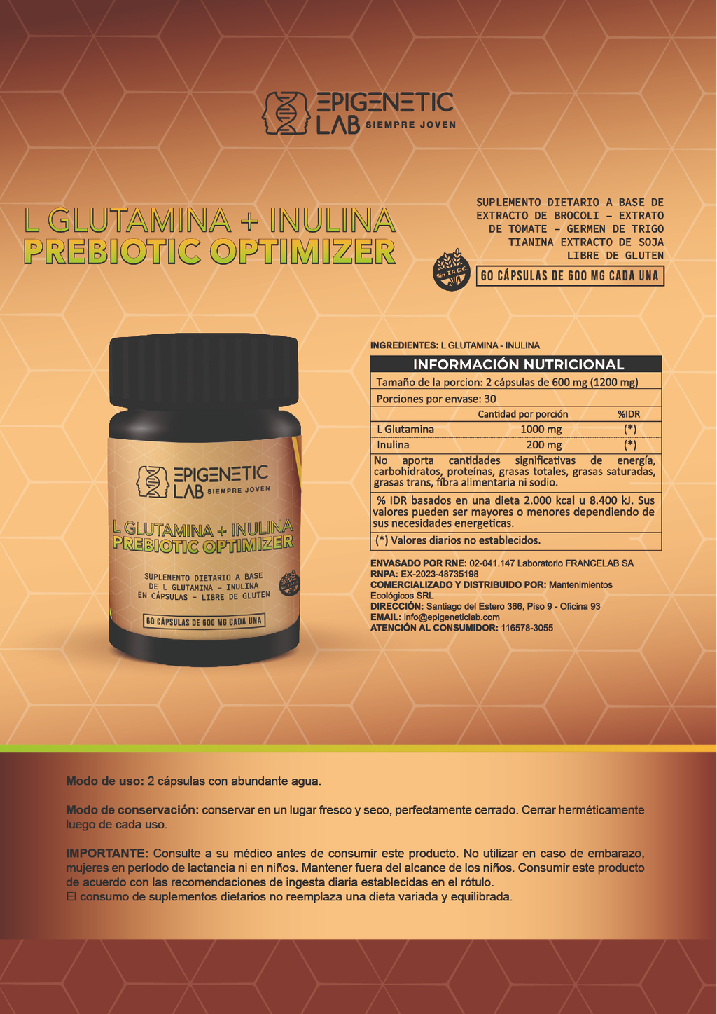 GLUTAMINA + INULINA PREBIOTIC OPTIMIZER X 60 CAPSULAS DE 600 MG SIN TACC