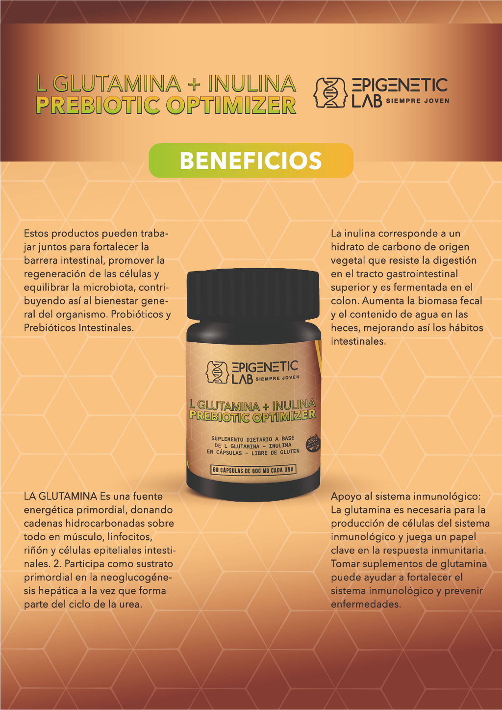 Uso de la Glutamina + Inulina Introducción: La glutamina y la inulina son dos compuestos que han ganado interés en el ámbito de la salud y la nutrición debido a sus potenciales beneficios para el cuerpo humano. Ambos son considerados suplementos dietéticos que pueden ser utilizados para mejorar la salud intestinal, fortalecer el sistema inmunológico y promover el bienestar general. En este informe, exploraremos el uso de la glutamina y la inulina, así como su combinación, sus efectos sobre la salud y su aplicación práctica.