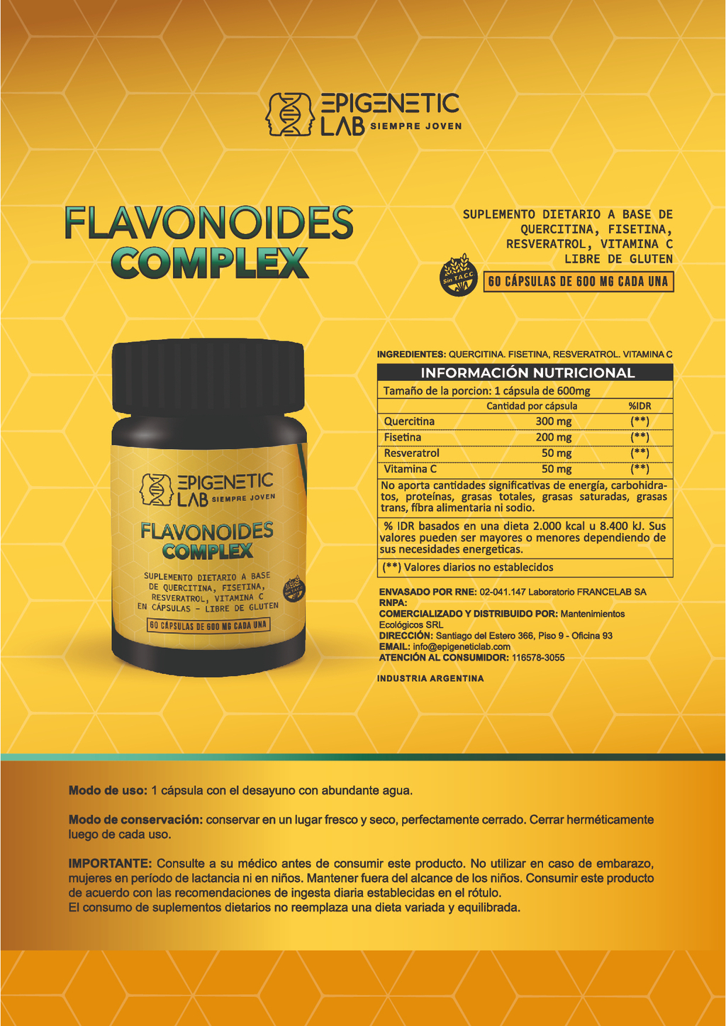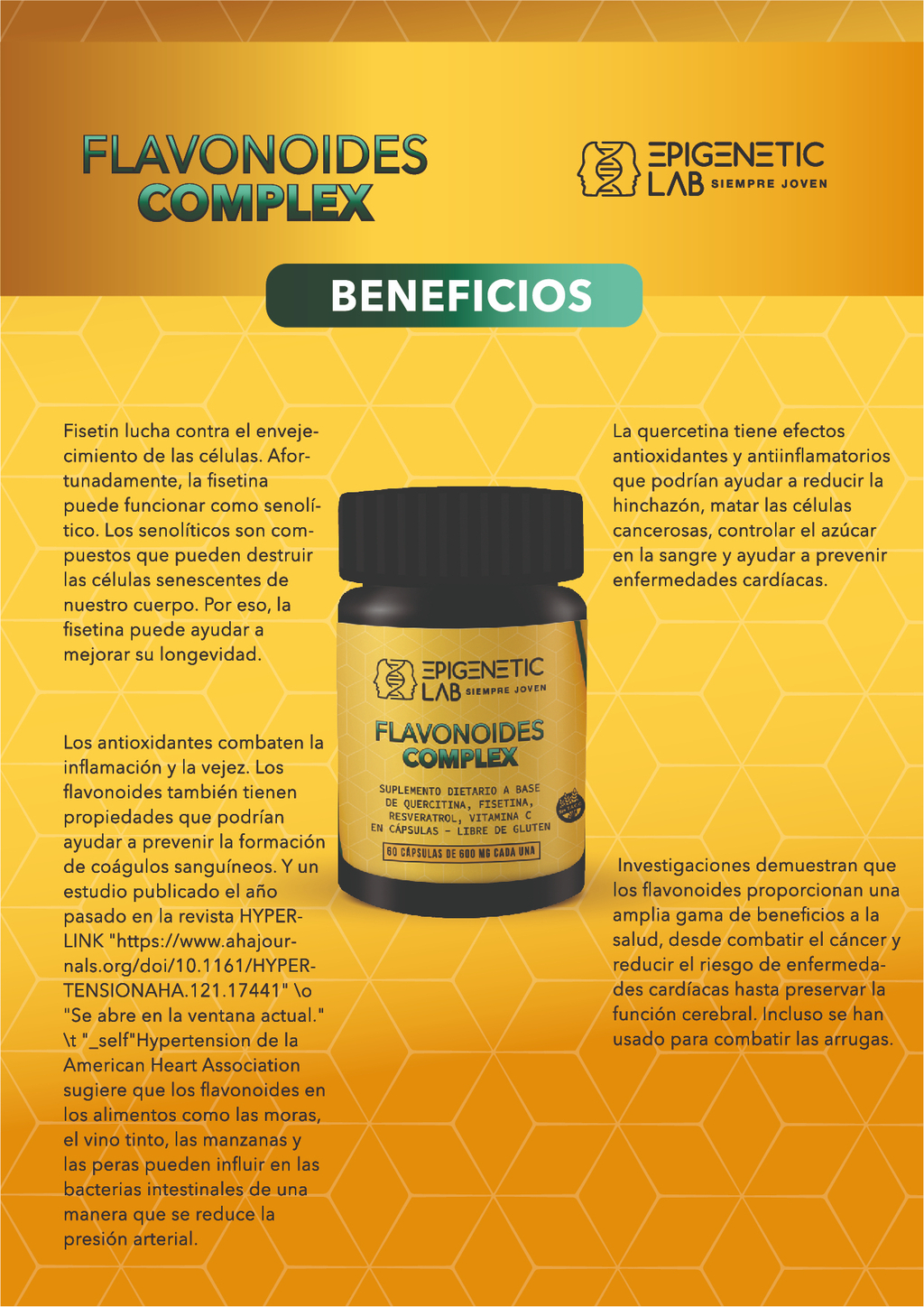 DOSIS: 1 CAPSULA CON EL DESAYUNO LINEA: GOLD   Explorando los Poderosos Beneficios de los Flavonoides: Nutrientes Esenciales para una Salud Óptima   Los flavonoides son compuestos naturales que se encuentran en una amplia variedad de alimentos de origen vegetal, como frutas, verduras, hierbas, especias, té y vino tinto. Estos compuestos no solo son responsables de los vibrantes colores de muchas plantas, sino que también ofrecen una serie de beneficios significativos para la salud. En este artículo, exploraremos los numerosos beneficios de los flavonoides y cómo pueden mejorar nuestra salud en general.   Poderosos Antioxidantes: Los flavonoides son conocidos por su poder antioxidante, lo que significa que pueden neutralizar los radicales libres en el cuerpo y proteger las células del daño oxidativo. Este efecto antioxidante puede ayudar a prevenir enfermedades crónicas como enfermedades cardíacas, diabetes y cáncer, y también puede retrasar el proceso de envejecimiento.   Protección Cardiovascular: Varios estudios han demostrado que los flavonoides pueden tener efectos beneficiosos sobre la salud cardiovascular. Ayudan a mejorar la función de los vasos sanguíneos, reducir la presión arterial, disminuir el riesgo de coágulos sanguíneos y mejorar el perfil lipídico al reducir los niveles de colesterol LDL ("malo") y aumentar los niveles de colesterol HDL ("bueno").   Apoyo a la Salud Cerebral: Los flavonoides tienen la capacidad de atravesar la barrera hematoencefálica y ejercer efectos protectores sobre el cerebro. Se ha demostrado que mejoran la función cognitiva, protegen contra el deterioro cognitivo relacionado con la edad y reducen el riesgo de desarrollar enfermedades neurodegenerativas como el Alzheimer y el Parkinson.   Reducción del Riesgo de Diabetes: Los flavonoides pueden ayudar a mejorar la sensibilidad a la insulina y regular los niveles de azúcar en la sangre, lo que puede ser beneficioso para prevenir y controlar la diabetes tipo 2. Además, algunos flavonoides, como la quercetina, pueden proteger las células pancreáticas productoras de insulina del daño oxidativo.   Acción Antiinflamatoria: Los flavonoides tienen propiedades antiinflamatorias que pueden ayudar a reducir la inflamación en el cuerpo y aliviar los síntomas de enfermedades inflamatorias crónicas como la artritis, la enfermedad inflamatoria intestinal y la enfermedad periodontal.   Cómo Incorporar los Flavonoides en tu Dieta:   Puedes aumentar tu ingesta de flavonoides al incluir una variedad de alimentos ricos en estos compuestos en tu dieta diaria. Algunas fuentes excelentes de flavonoides incluyen:   Frutas: como manzanas, bayas, uvas, cítricos y cerezas. Verduras: como cebollas, espinacas, brócoli y pimientos. Legumbres: como frijoles, lentejas y guisantes. Granos enteros: como quinoa, cebada y avena. Hierbas y especias: como el perejil, el tomillo, el orégano y la cúrcuma. Té: tanto el té verde como el té negro son ricos en flavonoides. Conclusión:   Los flavonoides son compuestos vegetales potentes y beneficiosos que ofrecen una amplia gama de beneficios para la salud, que van desde su capacidad antioxidante hasta su acción antiinflamatoria y su protección cardiovascular y cerebral. Al incluir una variedad de alimentos ricos en flavonoides en tu dieta diaria, puedes mejorar tu salud en general y reducir el riesgo de desarrollar enfermedades crónicas.
