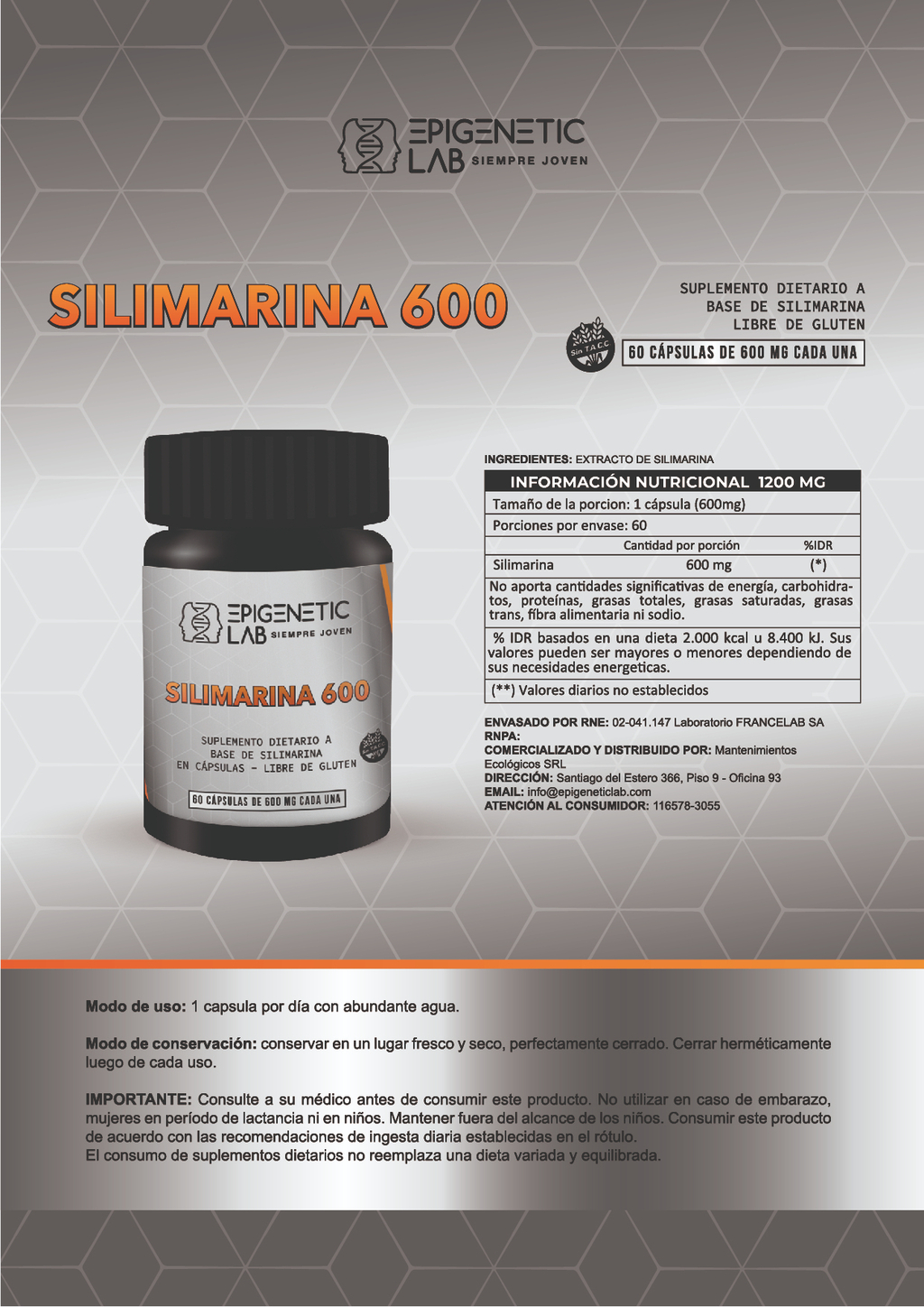 CARDO MARIANO SILIMARINA X 60 CAPSULAS DE 600 MG MANTENIMIENTOS ECOLOGICOS SRL MARCA EPIGENETIC LAB PORCION 2 CAPSULAS POR DIA BENEFICIOS ANTIOXIDANTE ANTICANCERIGENO CARDIOTONICO DISMINUYE EL COLESTEROL PROTEGE EL HIGADO, ESTOMAFO Y VESICULA¿Qué beneficios tiene tomar silimarina?La silimarina también tiene acción hepatoprotectora y antitóxica, actuando principalmente como eliminador de radicales libres. Favorece la eliminación de toxinas y tiene efecto colagogo promoviendo la secreción de bilis. Demuestra una mejor en los problemas de vesícula biliar y evita la formación de cálculos biliares.¿Cuánto tarda el cardo mariano en limpiar el hígado?Tras un tratamiento de ocho semanas se observó que el tratamiento con cardo mariano protegió con eficacia al hígado de los cambios en sus tejidos, además redujo los niveles de colesterol total y triglicéridos.¿Qué personas no deben tomar cardo mariano?Además, las personas que tienen alergia a los crisantemos, las caléndulas y las margaritas también pueden presentar reacciones alérgicas al cardo mariano. Las mujeres con enfermedades hormonodependientes (como cáncer de mama, de útero o de ovario, endometriosis o fibromas uterinos) deben evitar el cardo mariano.¿El cardo mariano reduce la presión arterial?El cardo mariano podría reducir la presión arterial alta a través de beneficios indirectos   DOSIS RECOMENDADA: Adultos: tomar 2 cápsulas en el almuerzo o en la cena con un vaso de agua.