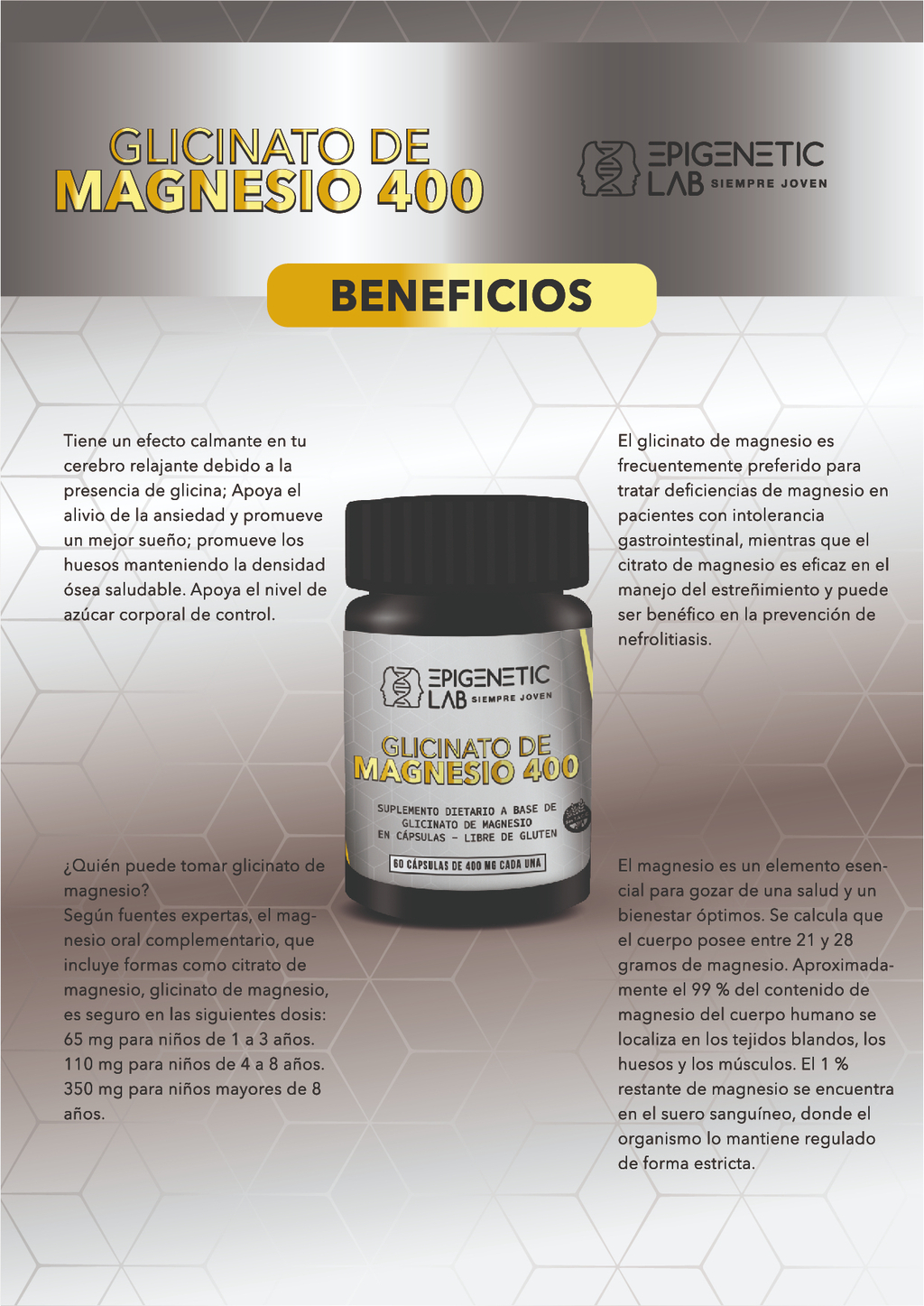 Glicinato de Magnesio: Un Suplemento Poderoso para la Salud y el Bienestar El magnesio es un mineral esencial que desempeña numerosos roles importantes en el cuerpo humano, desde el mantenimiento de la salud ósea hasta la función muscular y nerviosa adecuada. Sin embargo, muchas personas no obtienen suficiente magnesio de su dieta sola, lo que puede llevar a deficiencias y una variedad de problemas de salud. Es aquí donde entra en juego el glicinato de magnesio, una forma altamente absorbible de este vital mineral que ofrece una serie de beneficios para la salud. Vamos a sumergirnos en los secretos del glicinato de magnesio y explorar por qué podría ser una adición valiosa a tu régimen de suplementos: 1. Alta Absorción y BiodisponibilidadEl glicinato de magnesio es una forma quelada de magnesio, lo que significa que está unido a la glicina, un aminoácido que aumenta su absorción en el intestino. Esta forma única permite que el magnesio se absorba más eficientemente en el cuerpo en comparación con otras formas de suplementos de magnesio, como el óxido de magnesio. 2. Apoyo para la Salud ÓseaEl magnesio desempeña un papel crucial en la salud ósea al ayudar a mantener la densidad mineral ósea y promover la absorción adecuada de calcio en los huesos. El glicinato de magnesio puede ayudar a prevenir la pérdida ósea y reducir el riesgo de osteoporosis, especialmente en personas mayores y aquellas con deficiencia de magnesio. 3. Relajación Muscular y Reducción del EstrésEl magnesio es conocido por su capacidad para relajar los músculos y aliviar la tensión, lo que puede ayudar a reducir los calambres musculares, los espasmos y la rigidez. El glicinato de magnesio es especialmente útil en este sentido debido a la presencia de glicina, un aminoácido con propiedades relajantes que promueve la calma y el bienestar. 4. Mejora del Sueño y Reducción de la AnsiedadEl magnesio desempeña un papel importante en la regulación del ciclo del sueño y la producción de neurotransmisores relacionados con el estado de ánimo, como la serotonina y la melatonina. Tomar glicinato de magnesio antes de acostarse puede ayudar a mejorar la calidad del sueño y reducir la ansiedad, promoviendo así un descanso reparador. 5. Soporte CardiovascularEl magnesio es vital para la salud del corazón y el sistema cardiovascular. Ayuda a regular el ritmo cardíaco, mantener la presión arterial dentro de un rango saludable y prevenir la calcificación de las arterias. El glicinato de magnesio puede ayudar a proteger contra enfermedades cardíacas y accidentes cerebrovasculares al mejorar la función cardiovascular. 6. Alivio de los Síntomas del Síndrome Premenstrual (SPM)Muchas mujeres experimentan síntomas incómodos asociados con el síndrome premenstrual, como calambres abdominales, cambios de humor y fatiga. El glicinato de magnesio puede ayudar a aliviar estos síntomas al regular los niveles hormonales y reducir la sensibilidad al dolor. En resumen, el glicinato de magnesio es un suplemento poderoso que ofrece una variedad de beneficios para la salud, desde el apoyo óseo y muscular hasta la mejora del sueño y la reducción del estrés. Incorporar este mineral vital en tu régimen de suplementos puede ser una forma efectiva de optimizar tu salud y bienestar general. Como siempre, es importante consultar con un profesional de la salud antes de comenzar cualquier nuevo suplemento, especialmente si estás embarazada, amamantando o tomando otros medicamentos.